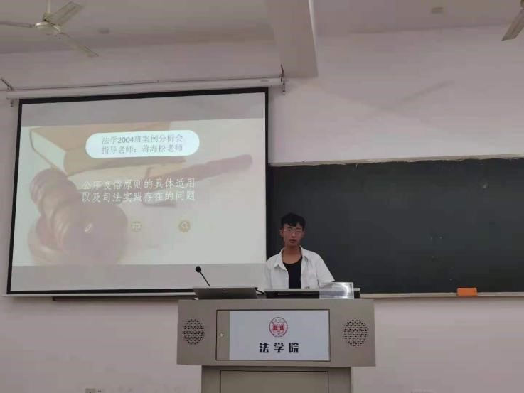 305室举行了案例分析会。法学2004班班主任、法理学授课导师蒋海松副教授担任讲评老师,法学2004班学习委员杨仁担任主持人,王宇柔、潘霖、闫晴晴三位同学分别对三起中外公序良俗典型案例进行评析,同学们进行了广泛讨论。