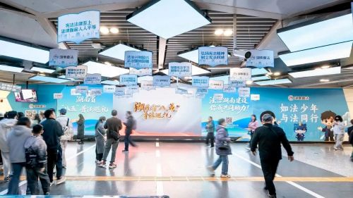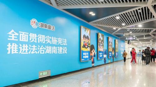 地铁站还陈列了习近平法治思想学习实践基地成果展,湖南大学基地等八个基地的宣传展板精彩亮相。