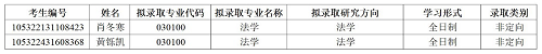 2022年硕士研究生复试录取工作实施细则》和法学学术型硕士考生的成绩排名,在相同专业的候补考生中按照学院录取规则及考生意愿进行补录。经向研究生院查询,候补考生中排名第一的考生已经调剂去其他高校,因此候补考生中排名第二的肖冬寒(考生编号105322131108423)和排名第三的黄铄凯(考生编号105322431608368)增补进入拟录取名单,具体信息见下表。