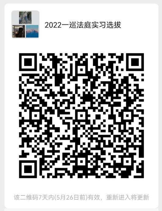 六、报名事项:报名采取个人自愿报名的方式,有意向的同学请于 5 月 22 日20:30 前将附件1《法律实习生推荐表》、附件2《法律实习生报名推荐汇总表》发送至研会邮箱 [email protected],报名推荐表除“在校表现及学校审核意见”一栏外均需填写,命名方式为“一巡实习+本人姓名+专业班级”。报名的同学请扫描下方二维码加群,后续面试时间及地点将在群内通知,请大家及时关注。