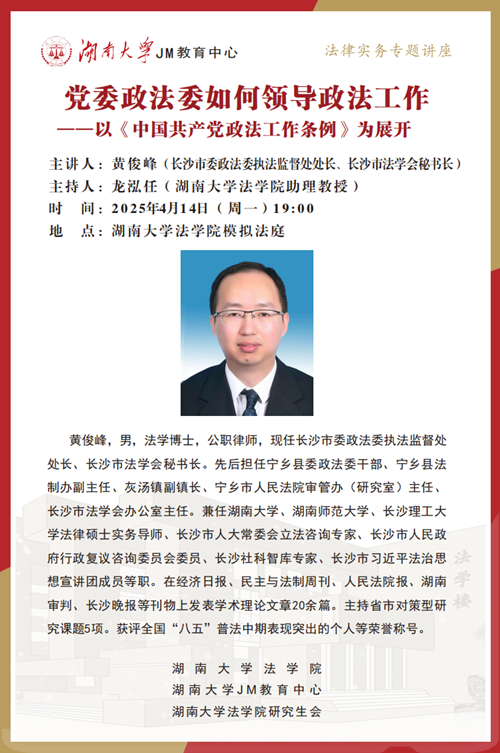 本次JM实务讲座邀请到长沙市委政法委执法监督处处长、长沙市法学会秘书长——黄俊峰,为大家讲述党委政法委如何领导政法工作——以《中国共产党政法工作条例》为展开,帮助大家了解相关实务问题,澳门新葡京网址-澳门新葡京线上