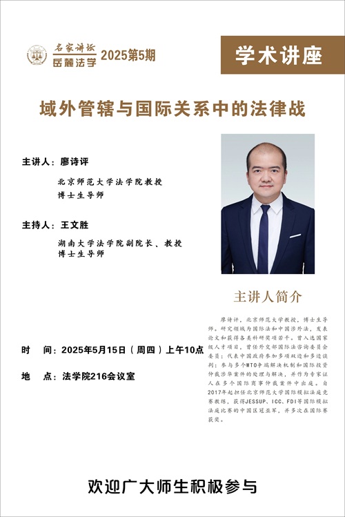 廖诗评,北京师范大学教授,博士生导师。研究领域为国际法和中国涉外法,发表论文和获得各类科研奖项若干。曾入选国家级人才项目,曾任外交部国际法咨询委员会委员:代表中国政府参加多项双边和多边谈判:参与多个WTO争端解决机制和国际投资仲裁涉华案件的处理与解决,并作为专家证人在多个国际商事仲裁案件中出庭。自2017年起担任北京师范大学国际模拟法庭竞赛教练,获得JESSUP、ICC、FDI等国际模拟法庭比赛的中国区冠亚军,并多次在国际赛获奖。