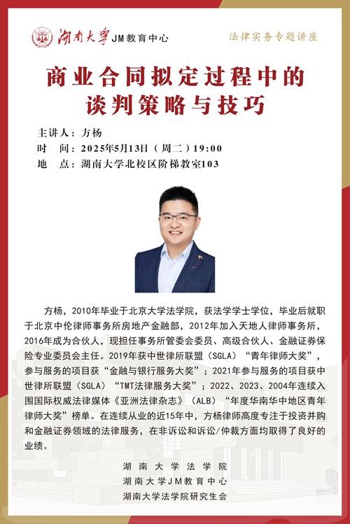 本次JM实务讲座邀请到湖南天地人律师事务所高级合伙人,管委会委员方杨律师,为大家讲述商业合同拟定过程中的谈判策略与技巧,帮助大家了解相关实务问题,欢迎同学们积极参与!