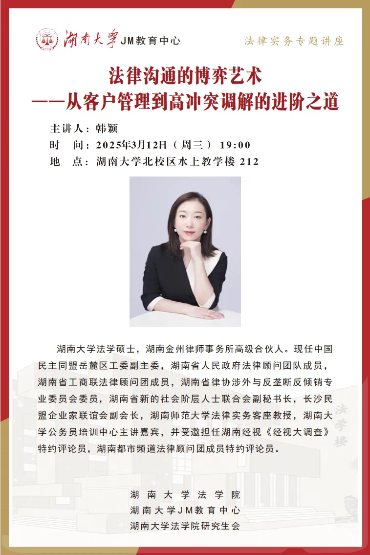 2025年3月12日晚19:00,湖南金州律师事务所高级合伙人韩颖律师在湖南大学北校区梯教103展开讲座。韩颖律师是湖南大学法学硕士,现任中国民主同盟岳麓区工委副主委、湖南省人民政府法律顾问团队成员、湖南省工商联法律顾问团成员、湖南省律协涉外与反垄断反倾销专业委员会委员等,同时还是多家媒体的特约评论员和法律顾问。本次讲座吸引了澳门新葡京网址