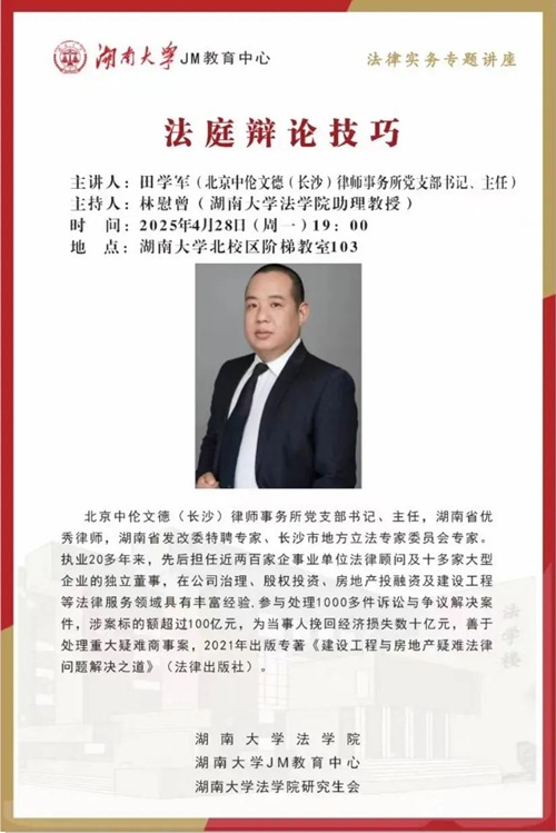 4月28日19:00,北京中伦文德(长沙)律所田学军律师在湖南大学北校区阶梯教室103开讲“法庭辩论技巧”。讲座伊始,林慰曾老师对田学军律师的到来表示热烈欢迎并表达了由衷的感谢。