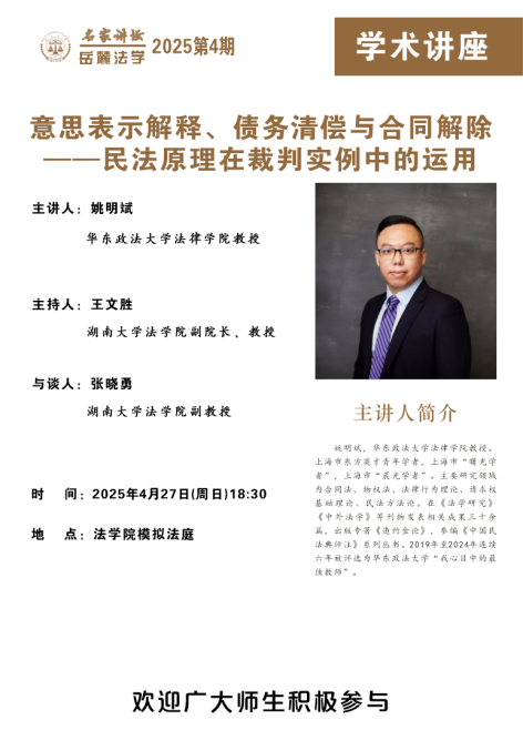 “岳麓法学名家讲坛”,以“意思表示解释、债务清偿与合同解除—民法原理在裁判实例中的运用”为主题,结合五大典型案例,深入剖析民法典背景下民事裁判的核心逻辑与方法论。讲座由澳门新葡京网址-澳门新葡京线上