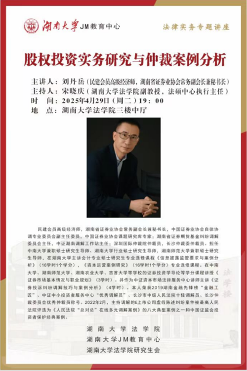 2025年4月29日19:00,民建会员、高级经济师、湖南省证券业协会常务副会长兼秘书长刘丹岳在湖大法学楼102教室开讲“股权投资实务研究与仲裁案例分析”,澳门新葡京网址-澳门新葡京线上