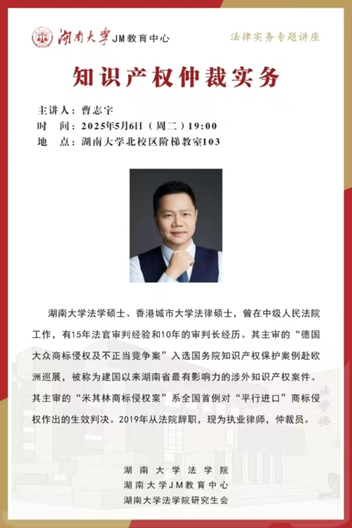 讲座的主讲人曹志宇老师履历丰富,实力非凡。他拥有湖南大学法学硕士和香港城市大学法律硕士双学位,曾在中级人民法院深耕15年,担任审判长长达10年。在法官生涯中,他积累了大量宝贵的审判经验,主审的“德国大众商标侵权及不正当竞争案”入选国务院知识产权保护案例赴欧洲巡展,成为湖南省极具影响力的涉外知识产权案件;主审的“米其林商标侵权案”更是全国首例对“平行进口”商标侵权作出生效判决的案件。2019年,曹志宇老师转型成为执业律师和仲裁员,在知识产权领域继续发光发热。