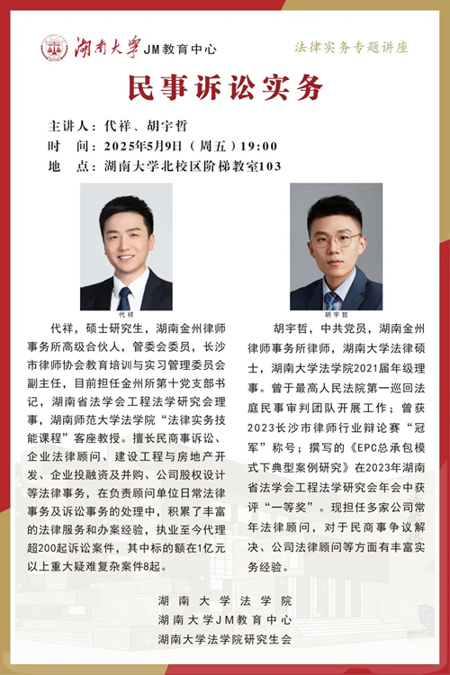 2025年5月9日晚7点,湖南金州律师事务所高级合伙人代祥、湖南金州律师事务所律师胡宇哲在湖大北校阶梯教室103开讲“民事诉讼实务”,澳门新葡京网址