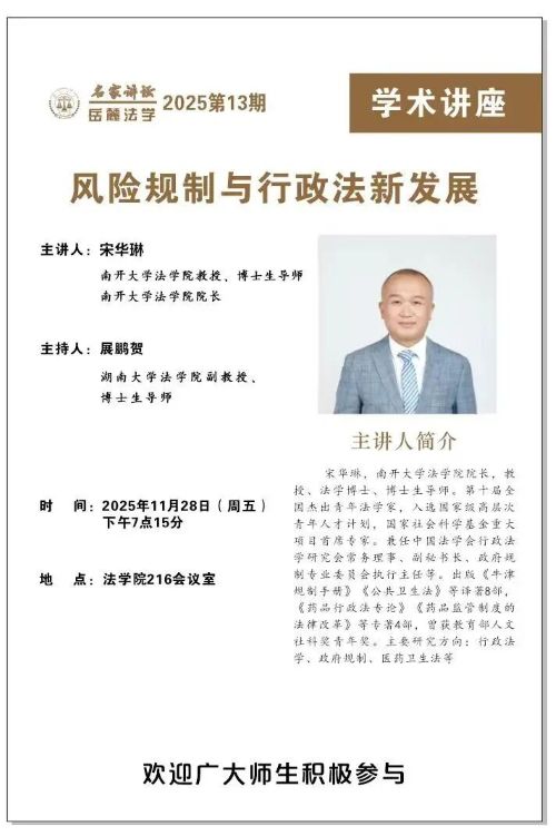 2025年第13期岳麓法学名家讲坛,以“风险规制与行政法新发展”为主题展开探讨。本次讲座由澳门新葡京网址-澳门新葡京线上