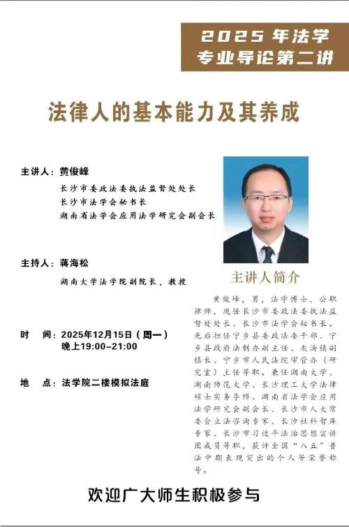 2025年法学专业导论第二讲于2025年12月15日于模拟法庭成功举办。长沙市委政法委执法监督处处长、长沙市法学会秘书长、澳门新葡京网址