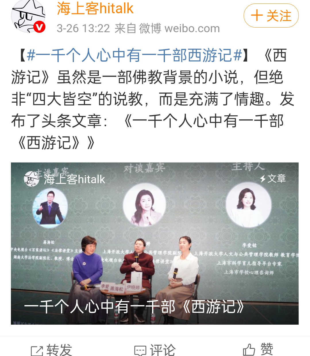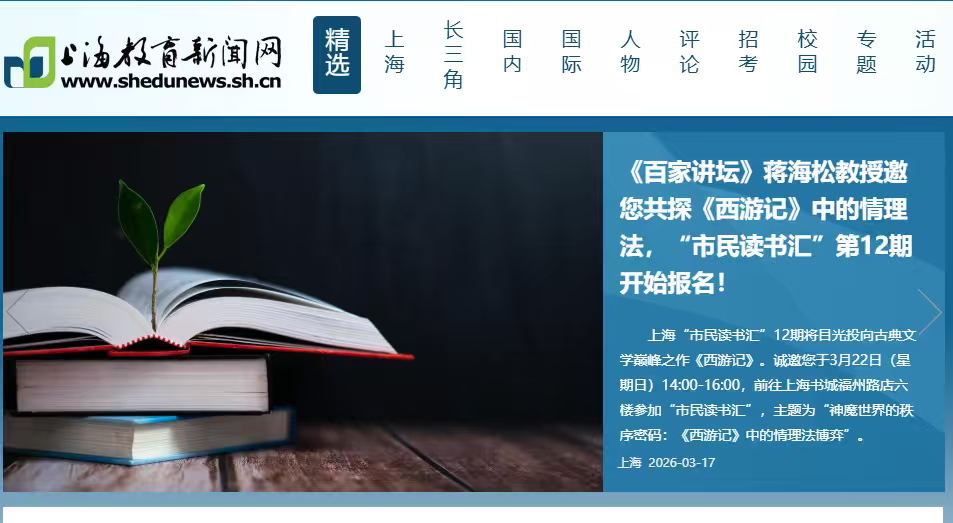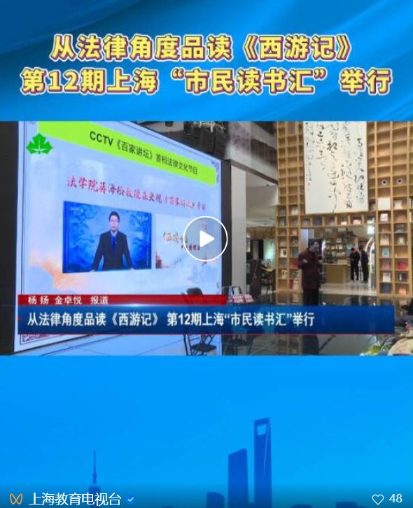 开展了三场讲座。这也是蒋老师新书《<西游记>中的情理法》上海分享会的系列活动。上海教育电视台、《光明日报》客户端、中国教育在线、《新闻晨报》、上观新闻、上海教育传媒网 、《中国文化报》、《光明教育家》、《上观新闻》、《教视新闻》等诸多媒体对讲座进行了密集报道。