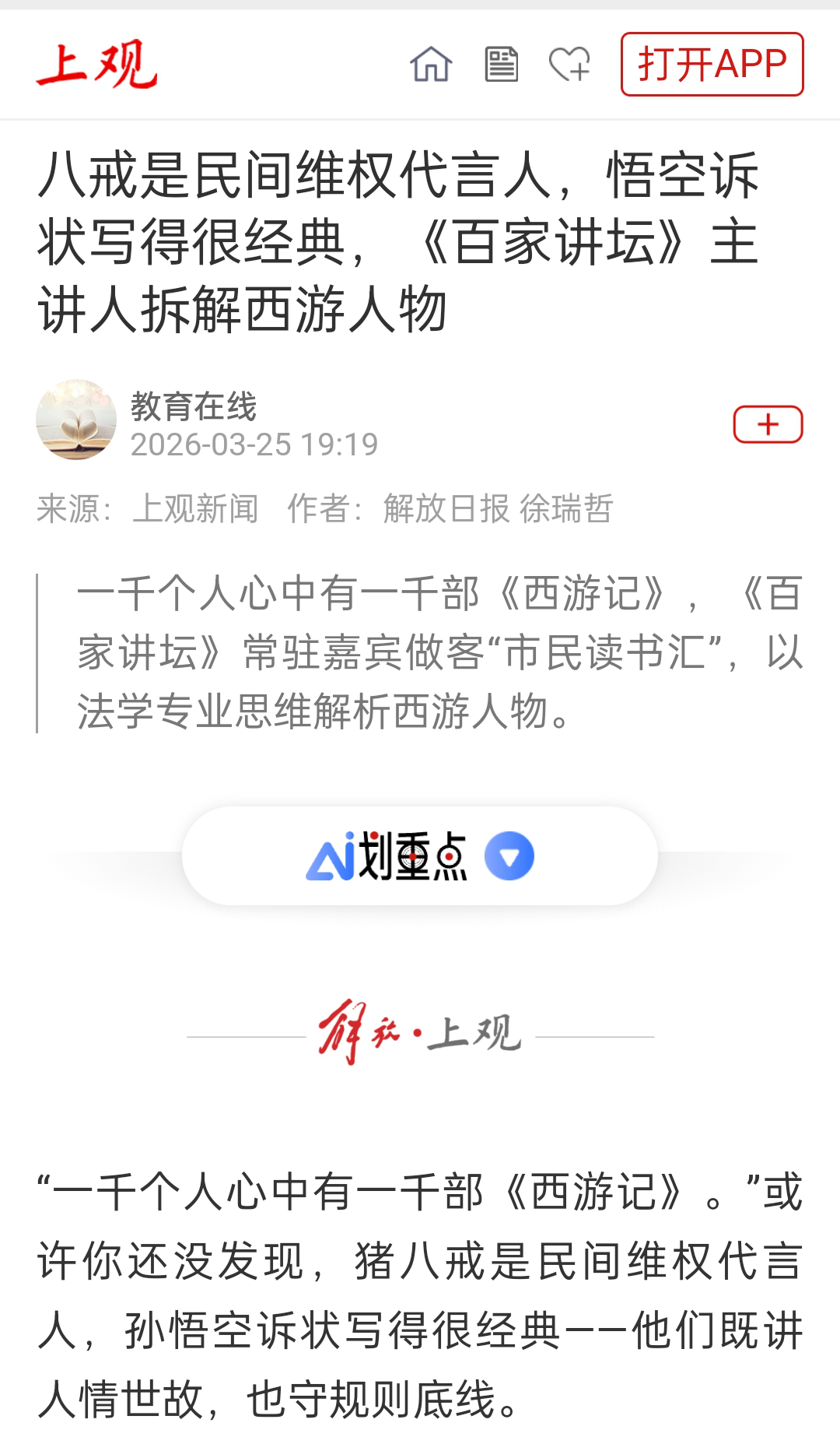 蒋海松教授认为,《西游记》中的法治智慧并非刻板教条,而是情、理、法三者的有机融合,既讲人情世故,也守规则底线,这也是名著历经岁月依旧鲜活的核心原因。他剖析,猪八戒身上藏着极强的私权保护意识,堪称古代民间维权的“代言人”。孙悟空棒打云栈洞大门捉拿八戒时,他俩“斗法”一开始斗的不是“法术”,而是法律——八戒第一时间怒斥:“你且去看看律条,打进大门而入,这个杂犯死罪哩!”短短一句话,尽显其对住宅权、私权神圣的清晰认知,暗合古代律法中“夜无故入人家”的惩戒法理,这种优先以律法维权的思维,远超单纯的武力对抗,凸显了朴素的法治观念。