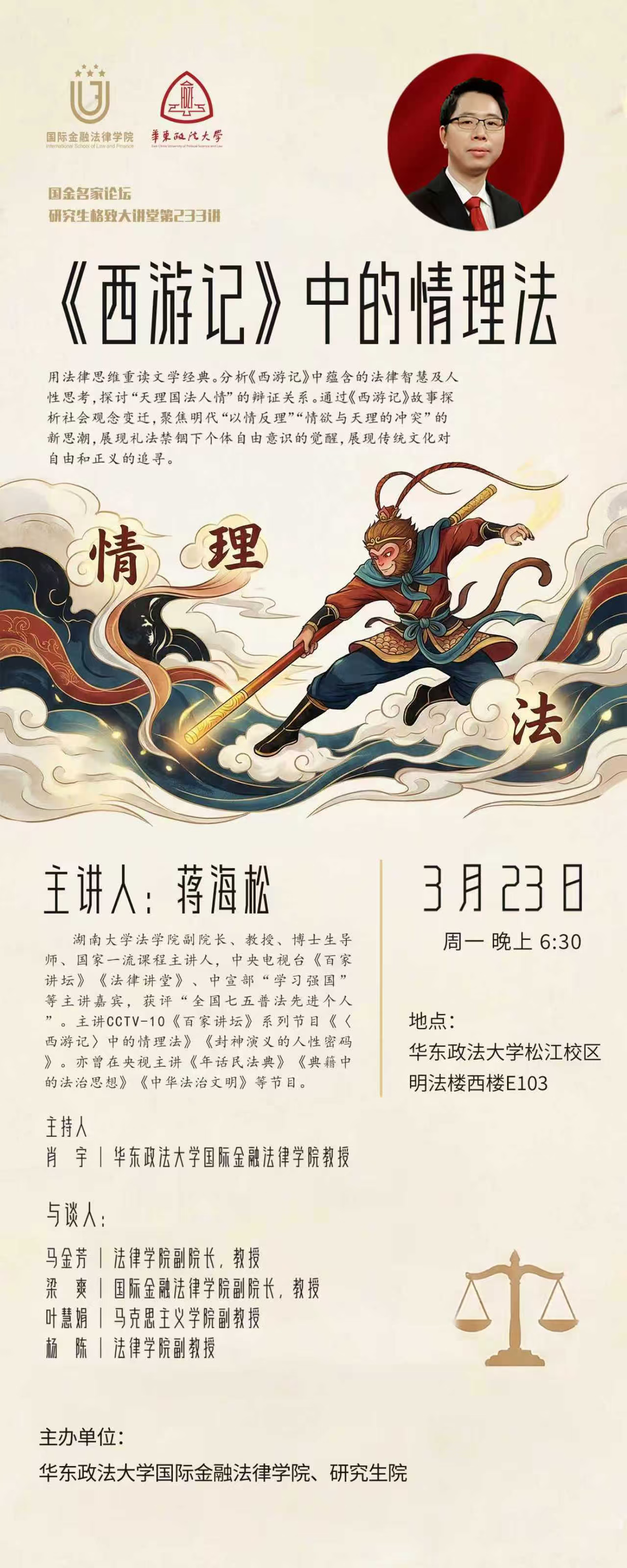 2026年3月23日晚,华东政法大学国际金融法律学院及研究生院联合举办了主题为“女妖以情叛法——《西游记》中的情理法”的精彩讲座。此次讲座隶属于“国金名家论坛”与“研究生格致大讲堂”系列讲座,由澳门新葡京网址-澳门新葡京线上