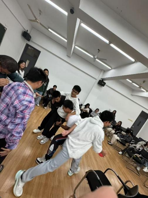 第二个游戏“抱团取暖”中,同学们手拉手围成一个大圈,心理委员会随机喊出一个数字,而同学们需要按照规定的人数抱在一团,最后落单的同学需要在表演节目和真心话中二选一。随着两轮游戏的进行,落单的同学也接受了相应的处罚。随着同学间的气氛逐渐进入活跃,我们进入了正式活动。
